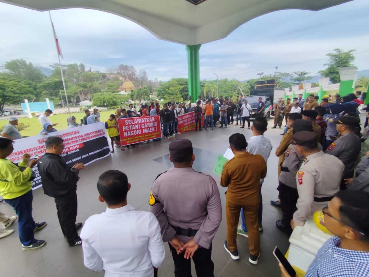 LIMAPULUH KOTA, METRO —Puluhan petani gambir melakukan aksi unjuk rasa di Kantor Bupati Limapuluh Kota kawasan Bukik Limau, Kecamatan Harau, Senin pagi (27/10). Mereka menuntut adanya standar harga dan kualitas gambir serta Peraturan Daerah (Perda) atau Peraturan Bupati untuk mendukung Peraturan Gubernur (Pergub) Nomor 14 tahun 2024 tentang Produk unggulan Perkebunan.