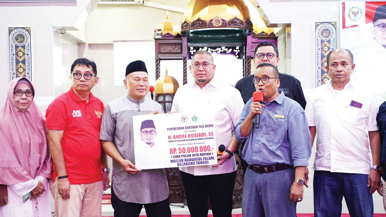 PADANG, METRO–Wakil Ketua Komisi VI DPR RI dari Fraksi Gerindra Andre Rosiade menyerahkan bantuan sebesar Rp50 juta untuk Masjid Nahdatul Islam, Kelurahan Belakang Tangsi, Kecamatan Padang Barat, Kota Padang, Senin (3/11). Pada kesempatan itu Andre juga memberikan bantuan puluhan juta untuk pembelian perlengkapan masjid dan bantuan organisasi-organisasi sosial.