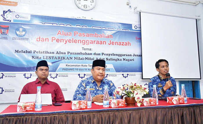 PADANG, METRO–Dinas Pendidikan dan Kebudayaan (Disdikbud) Kota Padang menggelar pelatihan Alua Pasambahan dan Penyelenggaraan Jenazah, dengan tema, “Melalui Alua Pasambahan dan Penyelenggaraan Jenazah Kita Lestarikan Nilai-Nilai Adat Salingka Nagari”, Selasa (11/11).