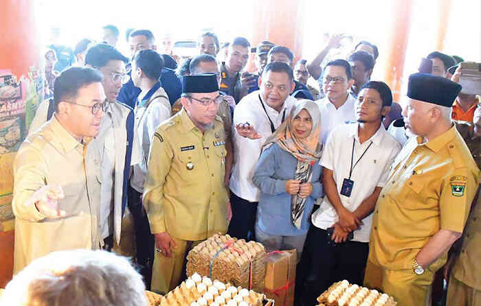 PADANG, METRO–Menteri Perdagangan (Mendag) RI, Budi Santoso bersama Gubernur Sumbar Mahyeldi Ansharullah meninjau pergerakan harga kebutuhan pokok di Pasar Raya Padang, Selasa (18/11). Kunjungan ini menjadi bagian dari persiapan menghadapi Natal dan Tahun Baru (Nataru), sekaligus memastikan rantai pasok pangan tetap terjaga.