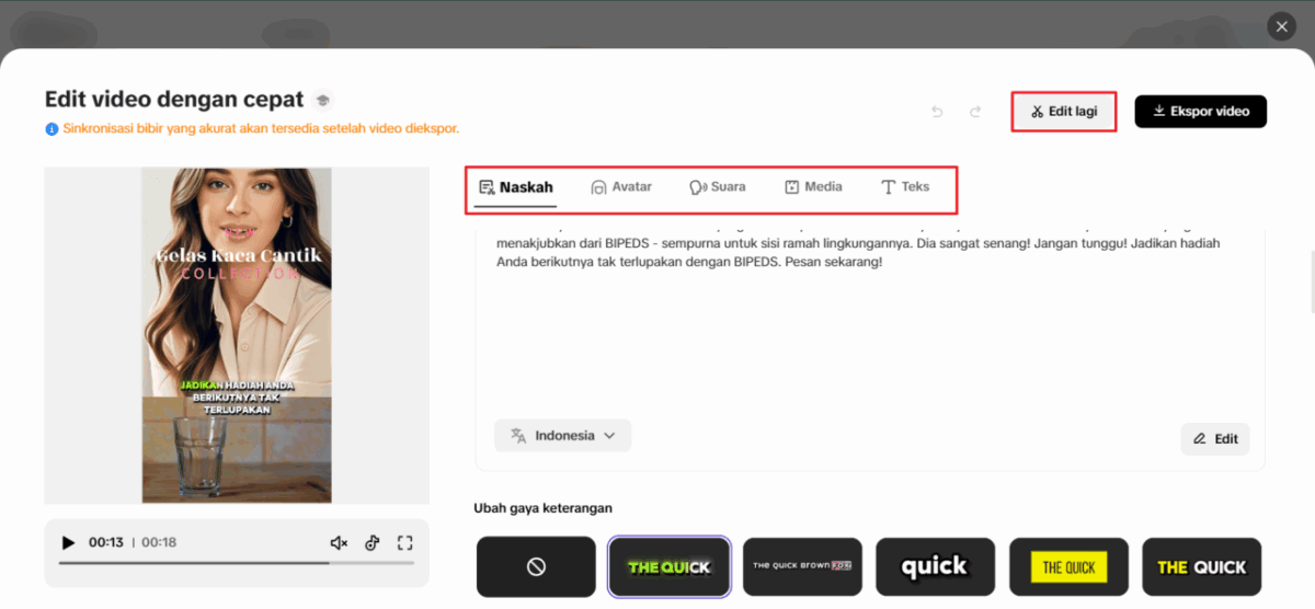 Pilih hasil yang paling menggambarkan suaramu. Perhalus takarir, narasi, atau gaya teks menggunakan “Sunting cepat.” Atau pilih “Sunting lebih lanjut” untuk memasuki kendali kreatif yang lebih dalam: warna, penyaring sinematik, butiran film dan efek audio, penyesuaian gerakan, pengaturan pencahayaan, dan membuat alur emosi dalam setiap adegan.
