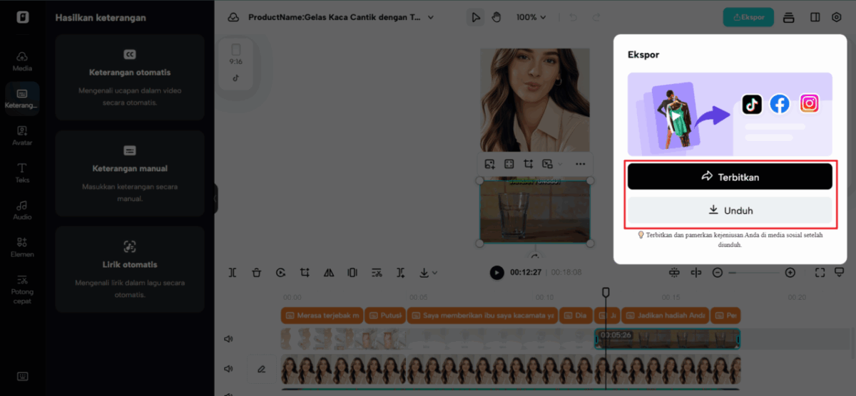 Tekan “Keluarkan” di kanan atas. Pilih “Unduh” untuk menyimpan videomu sambil mengubah jumlah gambar per detik, resolusi, kualitas, atau format. Atau tekan “Terbitkan” untuk langsung membagikannya ke TikTok, Instagram, atau Facebook dengan pengaturan yang telah kamu pilih. Alur kerja ini mengubah foto estetismu menjadi klip sinematik yang indah dan siap memikat penonton.