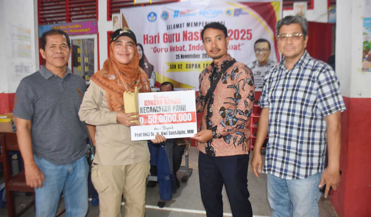 Bantuan tersebut diserahkan pada Minggu (7/12) di Posko Pengungsian SDN 02 Cupak Tangah, lokasi utama yang menampung ratusan warga terdampak. Karena kondisi kesehatan, Dwi Soetjipto tidak dapat hadir secara langsung. Ia menugaskan putra sulungnya, Aditya Wicaksono, untuk mewakili sekaligus menyampaikan pesan empatinya kepada masyarakat Pauh.