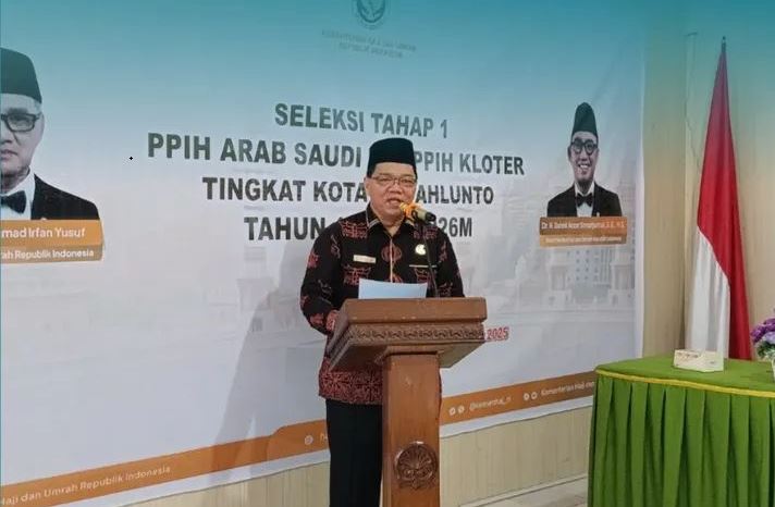 SAWAHLUNTO, METRO–Kakankemenag Dr. H. Dedi Wandra, M.A sampaikan sambutan Menteri Haji dan Umrah sekaligus secara resmi membuka kegiatan seleksi PPIH Arab Saudi dan PPIH Kloter Tahap I Tingkat Kab/Kota Tahun 1447H/2026M, Jumat (19/12).