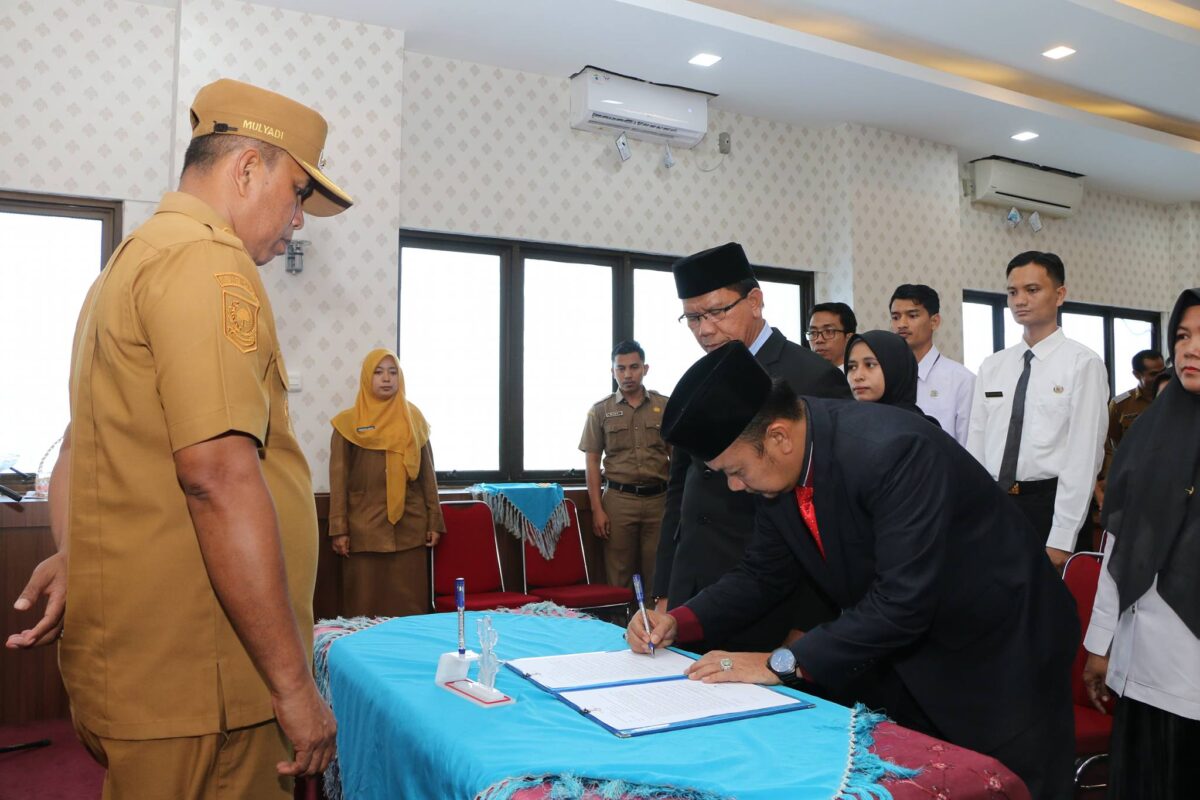 PARIAMAN, METRO–Wakil Wali Kota Pariaman, Mulyadi melantik dan mengambil sumpah jabatan 2 pejabat pimpinan tinggi pratama (Eselon II) dan 11 (sebelas) pejabat fungsional serta 1 pejabat pengawas di lingkungan Pemerintah Kota Pariaman, kemarin.
