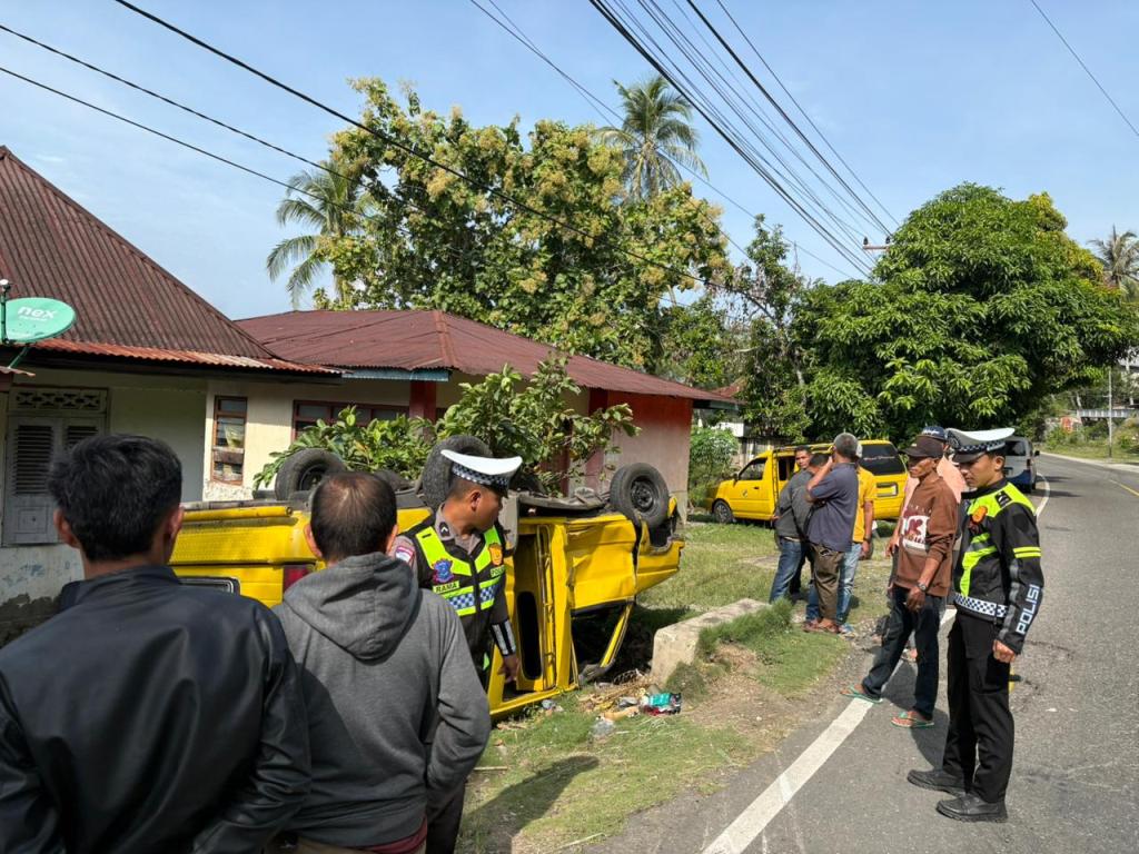 “Angkot bercat kuning tersebut terbalik dengan posisi keempat roda menghadap ke atas. Sopir dan 13 penumpang mengalami luka ringan. Dipastikan tidak ada korban jiwa dalam kecelakaan ini,” kata AKP Andri Perkasa.