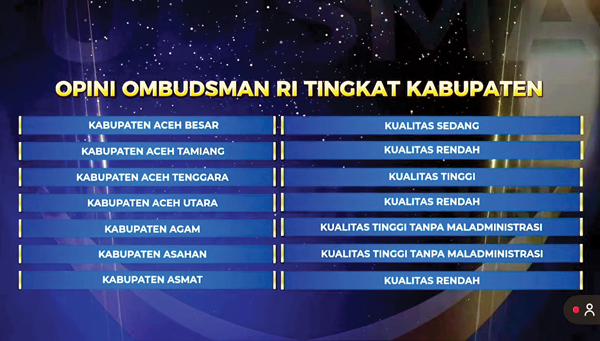 Ombudsman RI juga menjelaskan bahwa pada tahun 2025, sistem penilaian pelayanan publik mengalami pembaruan. Kategori penilaian kini terdiri atas Opini Kualitas Tertinggi, Kualitas Tinggi, Kualitas Sedang, Kualitas Rendah, dan Kualitas Terendah, menggantikan sistem zona hijau, kuning, dan merah. Perubahan ini bertujuan memberikan gambaran kualitas pelayanan publik yang lebih rinci dan terukur.
