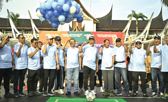 SUDIRMAN, METROGubernur Sumbar Mahyeldi Ansharullah, meng­hadiri kick-off penyiaran Piala Dunia FIFA World Cup 2026 yang diselenggarakan TVRI Sumbar di Jalan Sudirman, Kota Padang, Minggu (1/2). Kegiatan ini menandai kesiapan TVRI sebagai official broadcaster Piala Dunia 2026 di Indonesia.