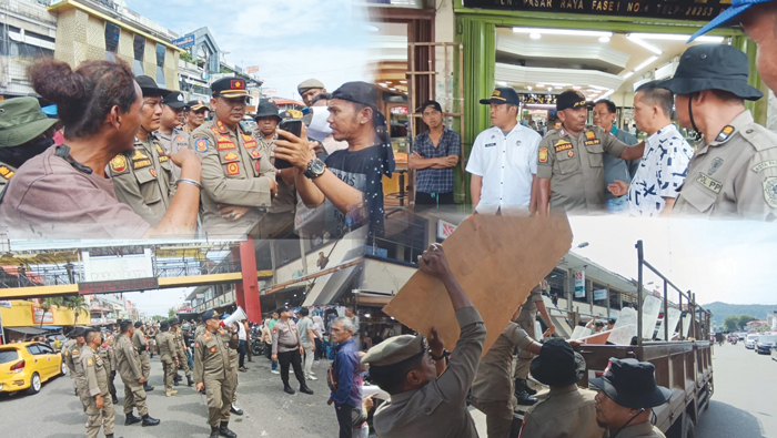 PASAR RAYA, METRO—Penertiban yang dilakukan tim gabungan Satuan Polisi Pamong Praja (Satpol PP), TNI, Polri, dan Dinas Perdagangan di kawasan selasar Pasar Raya Padang, Selasa (3/2), berakhir ricuh. Penertiban awalnya dilakukan sebagai bagian dari upaya menjaga ketertiban umum sekaligus mengembalikan fungsi selasar sebagaimana mestinya, yakni sebagai ruang aman dan nyaman bagi para pejalan kaki.