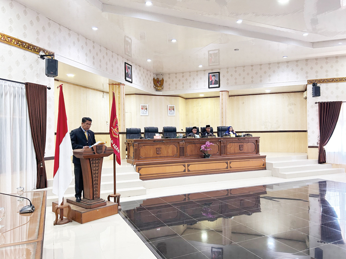 BACAKAN NOTA— Sekda M. Lutfi, membacakan Nota Penjelasan Bupati Agam tentang Pencabutan Perda Nomor 2 tahun 2018 tentang Pedoman BUMNag, dalam Sidang Paripurna, Senin (2/2).
