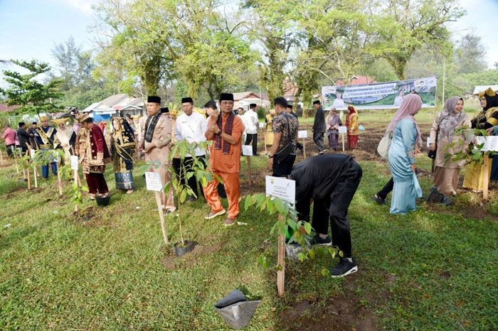 TANAM POHON— Wakil Wali Kota Pariaman Mulyadi didampingi Sekretaris Daerah Kota Pariaman Afrizal Azhar, Asisten I Elvis Chandra, dan seluruh Kepala OPD serta Camat melakukan penanaman pohon secara simbolis dibelakang GOR Rajo Bujang Kota Pariaman.
