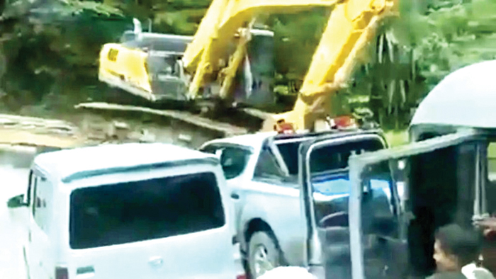 Para penumpang dan pengendara berhamburan keluar dari kendaraan ma­sing-masing untuk menyelamatkan diri, khawatir tertimpa alat berat yang jatuh. Beruntung, alat berat tersebut justru terguling ke sisi jalan dan tidak menimpa kendaraan yang berada di belakangnya.