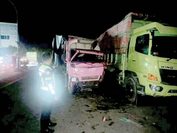 DHARMASRAYA, METROKecelakaan lalu lintas terjadi di Jalan Lintas Sumatera, tepatnya di kawasan Sungai Kambut, Kecamatan Pulau Punjung, Kabupaten Dharmasraya, Rabu (11/2) sekitar pukul 03.15 WIB. Sebuah truk Mitsubishi Colt Diesel me­na­brak dump truk yang se­dang terparkir di badan jalan. Akibat insiden ter­sebut, tiga orang menga­lami luka-luka.
