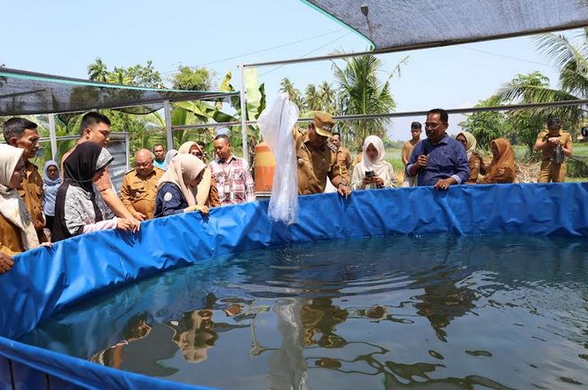 PARIAMAN, METRO—Wali Kota Pariaman, Yota Balad melakukan penebaran ribuan benih ikan lele yang dikelola Badan Usaha Milik Desa (BUMDes) Makmur Ampalu di Desa Ampalu dengan sitem bioflok di Desa Ampalu, Kecamatan Pariaman Utara, Kota Pariaman, kemarin. Yota Balad mengapresiasi langkah dari BUMDes Ampalu Makmur dalam mengelola potensi desa dibidang perikanan.
