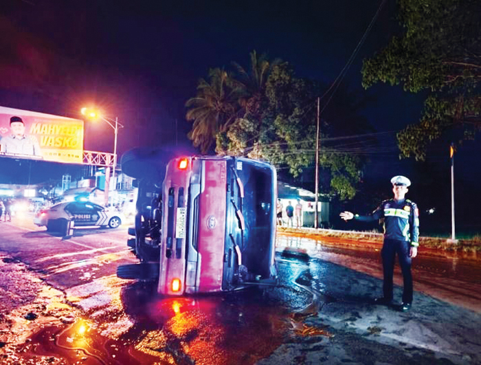 “Akibat benturan itu truk CPO terbalik dan minyak di dalam tangki tumpah ke badan jalan sehingga jalan menjadi licin,” ujarnya.