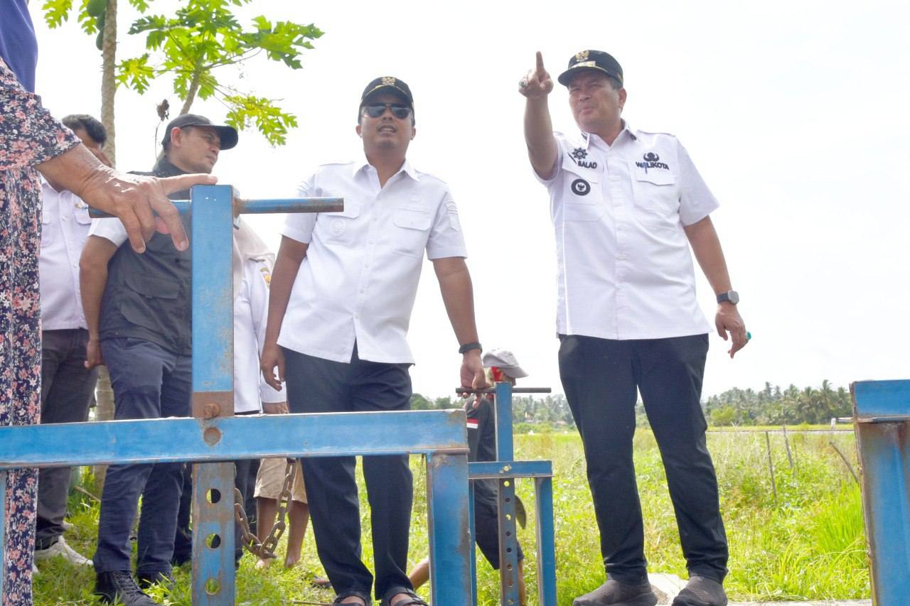 TINJAU IRIGASI— Wali Kota Pariaman Yota Balad bersama Wakil Gubernur Sumatera Barat Vasco Ruseimy, meninjau langsung kondisi irigasi.