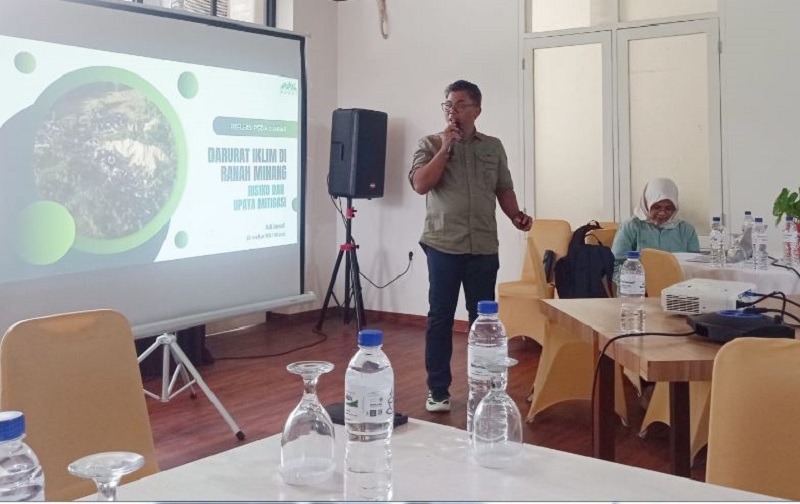 presentasikan— Direktur KKI Warsi Adi Junedi mempresentasikan Refleksi PSDA Sumbar, Darurat Iklim di Ranah Minang, Resiko dan Upaya Mitigasi dalam acara Media Ghatering di Suasso Restaurant Rimbo Kaluang Padang, Rabu (11/2).