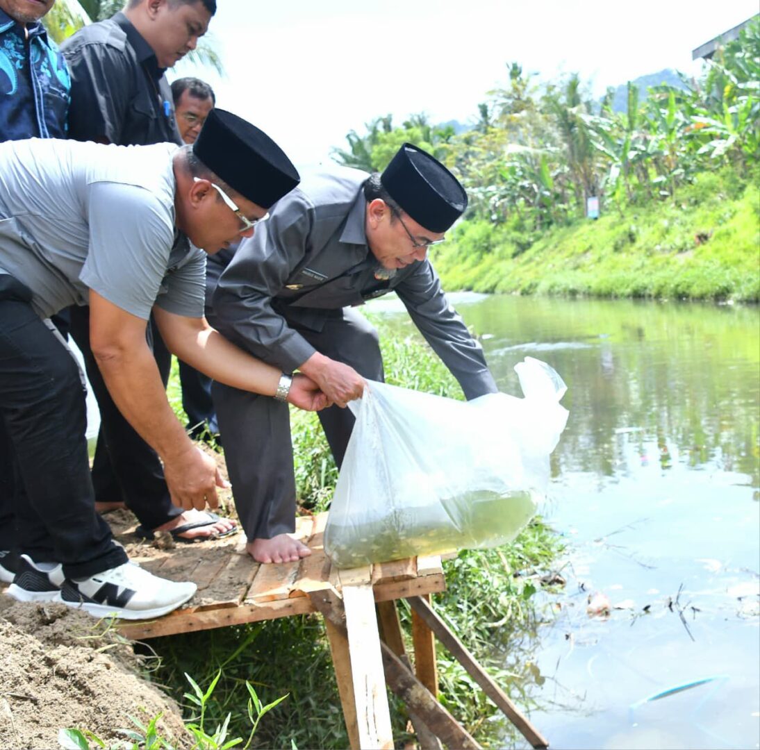 LB.BEGALUNG, METRO– Wakil Wali Kota Padang, Maigus Nasir, melepas 5.000 ekor bibit ikan nila di aliran Sungai Jirak, Kelurahan Koto Baru Nan XX, Kecamatan Lubuk Begalung, Jumat (13/2).