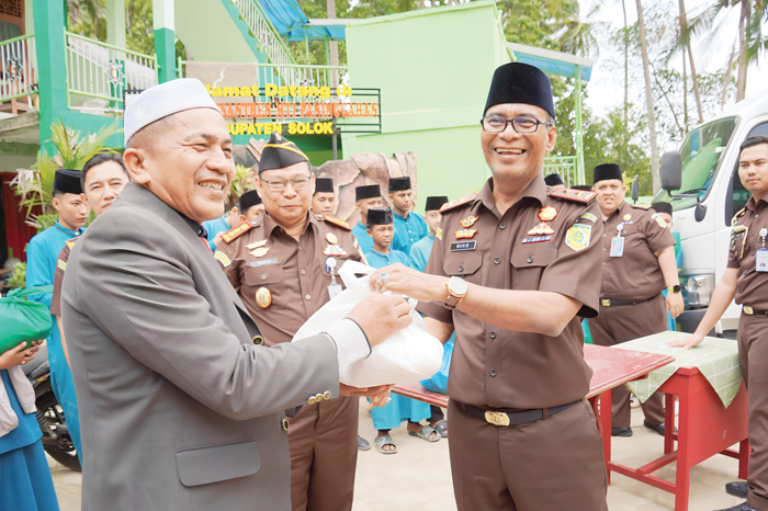 BERBAGI SEMBAKO— Kajati Sumbar, Muhibuddin saat menyalurkan bantuan sembako di Pesantren MTI Paninggahan, Kabupaten Solok.